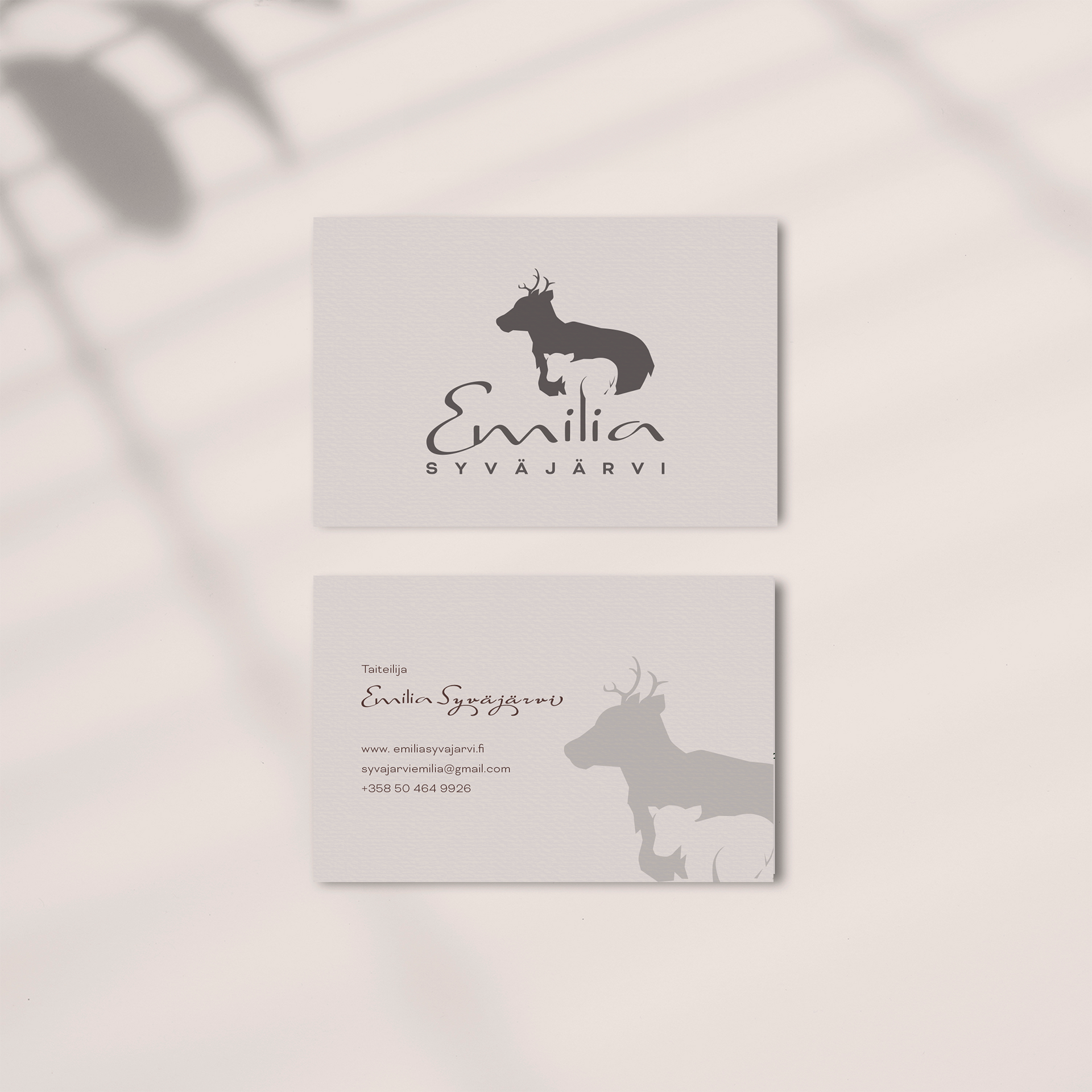 Suunnittelin logon Emilia Syväjärville, jonka taide ammentaa inspiraationsa Lapin luonnosta ja perinteisestä lappilaisesta elämäntavasta. Logon keskiöön muodostui vaadin ja vasan siluetti, joka kuvastaa herkkää yhteyttä luontoon ja eläimiin. Sivellinmaalausta henkivä typografia tuo mukaan taiteilijan käsialan. Suunnittelin Emilialle myös nettisivun ja verkkokaupan joita voit käydä katsomassa emiliasyvajarvi.fi
