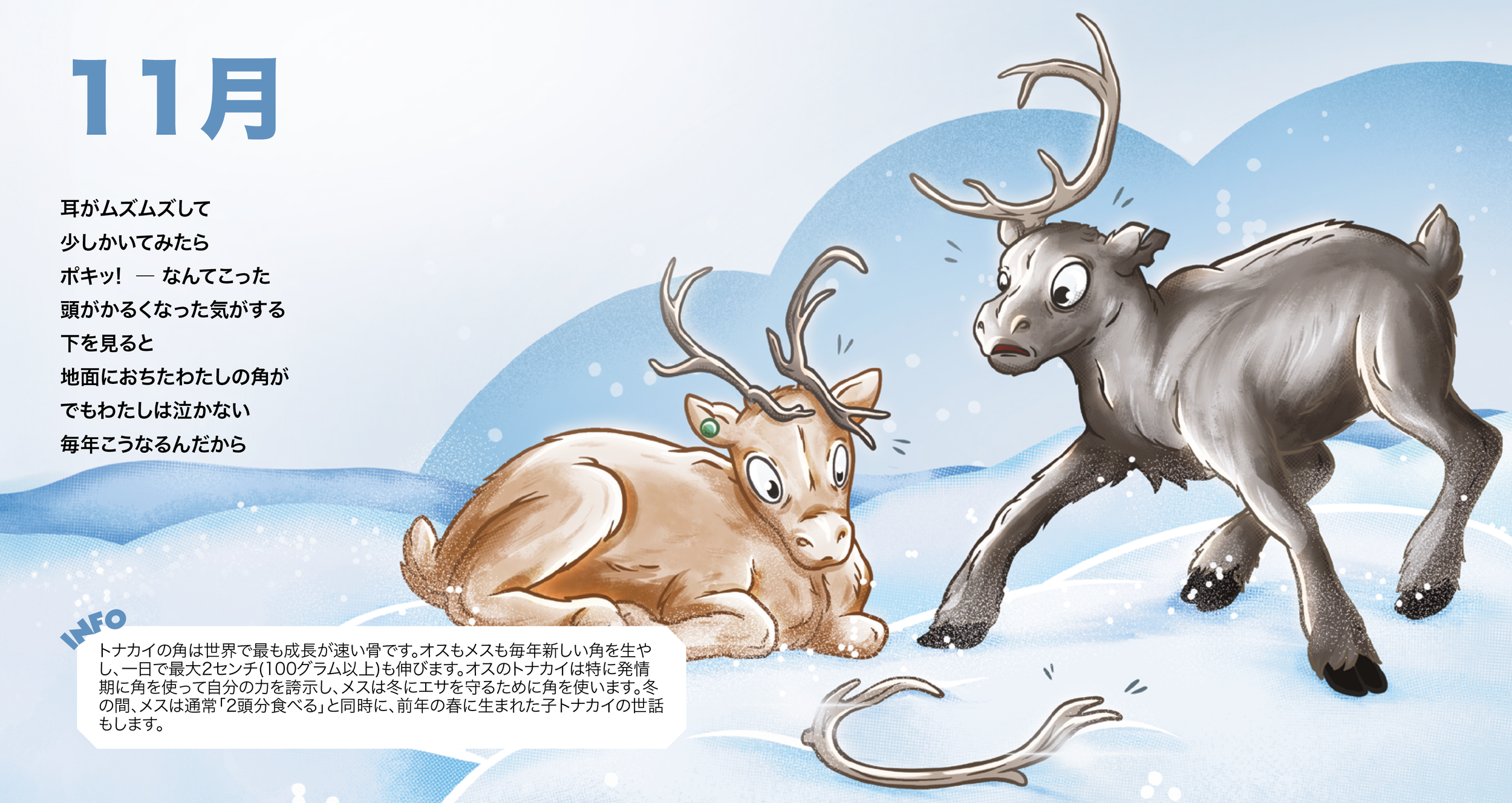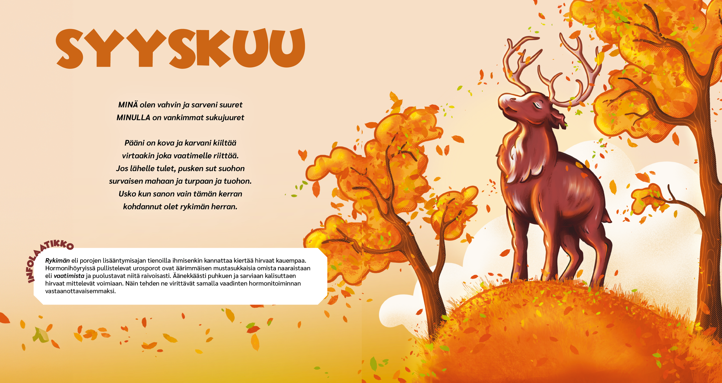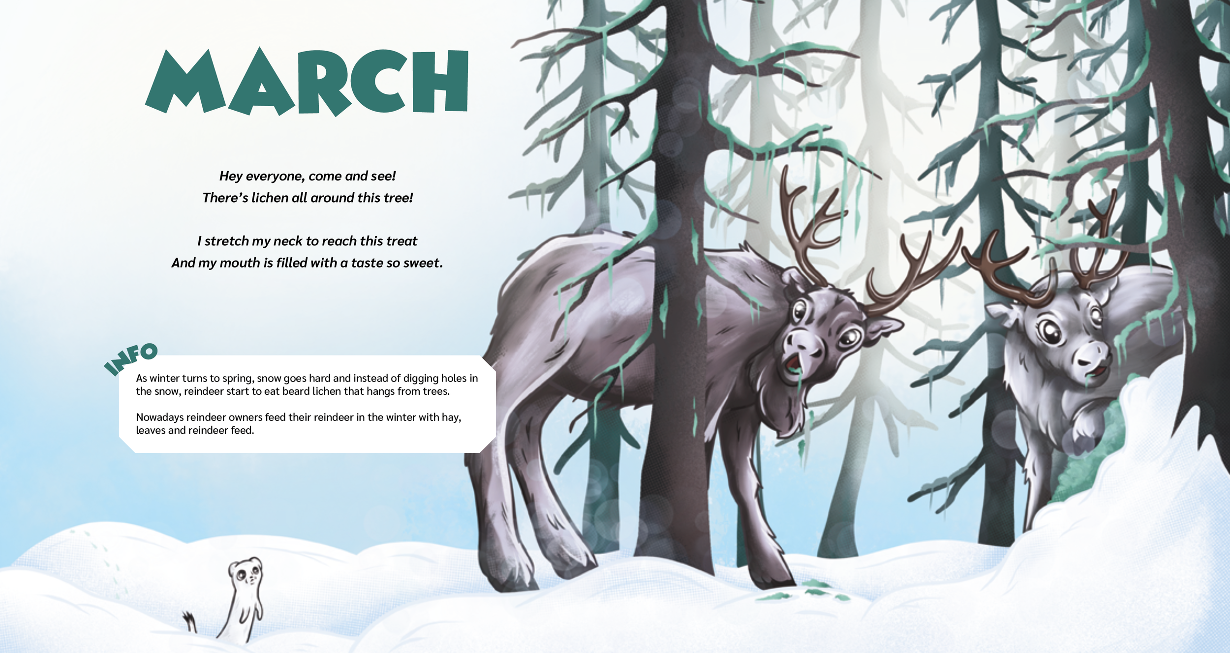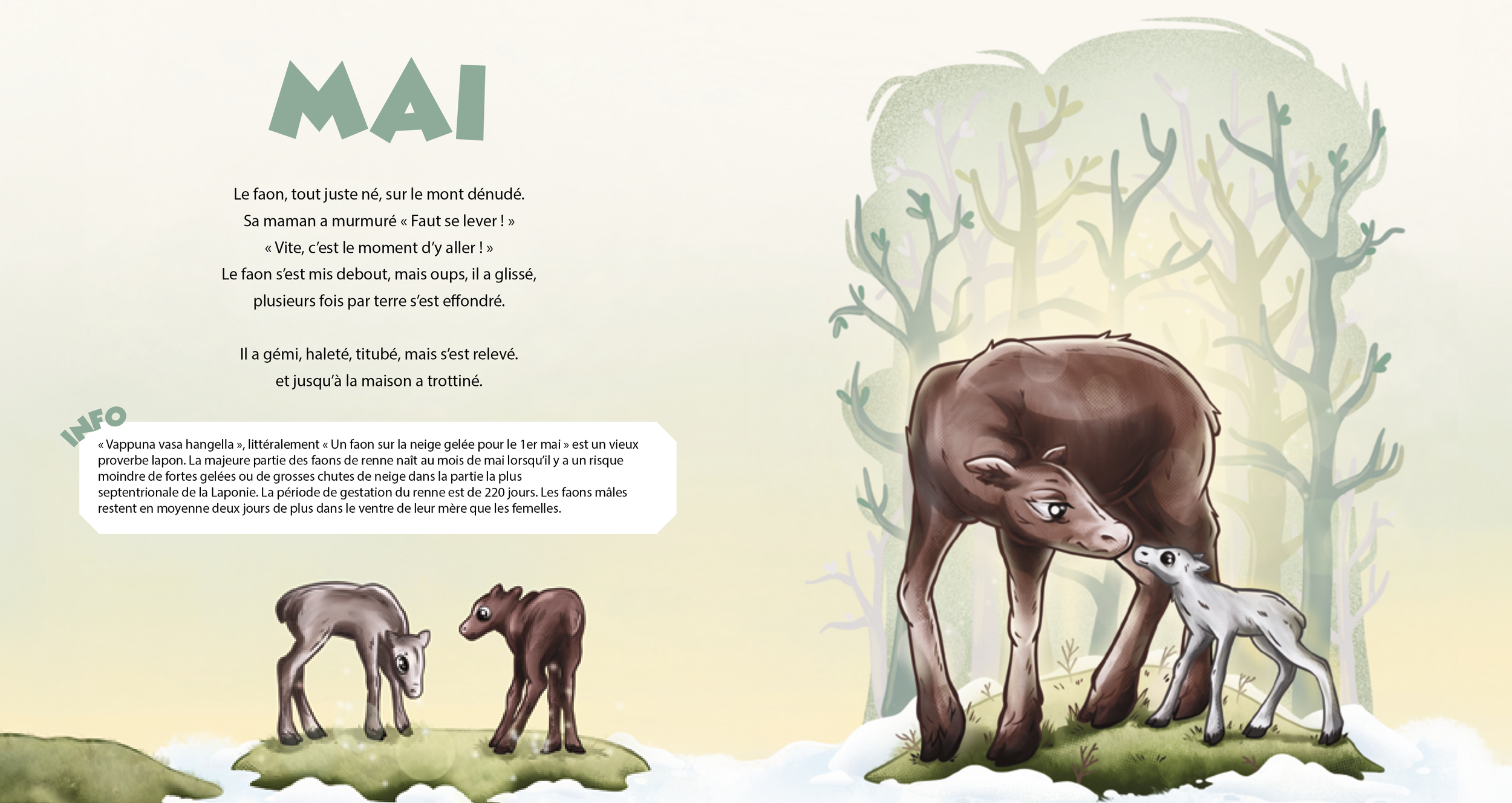 Teos ei perustu pelkkään mielikuvitukseen, vaan jokainen kuva ammentaa omista kokemuksistani ja kulttuurista, jossa poronhoito on osa arkea. Kuvituksen lisäksi suunnittelin kirjan typografian ja visuaaliset elementit, pitäen ne selkeinä mutta lapsille sopivina. Yhteistyössä kirjoittajan kanssa lisätyt infolaatikot rikastavat kokonaisuutta ja tekevät kirjasta kiinnostavan myös aikuisille.